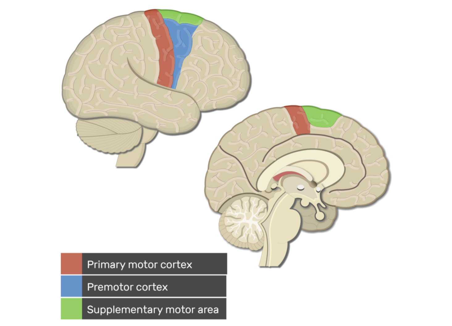 Primary motor cortex — первичная моторная кора (красная область) главный источник двигательных команд. Она расположена в прецентральной извилине. Здесь находятся крупные пирамидные нейроны (клетки Беца), аксоны которых формируют: кортико-спинномозговой (пирамидный) путь. Именно эти нейроны отправляют сигнал: мозг → спинной мозг → мотонейрон → мышца.